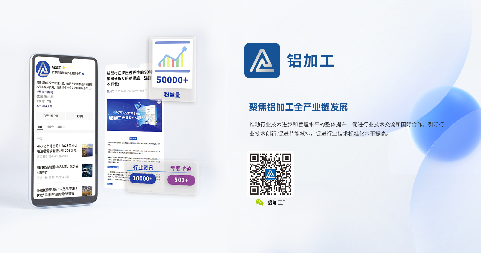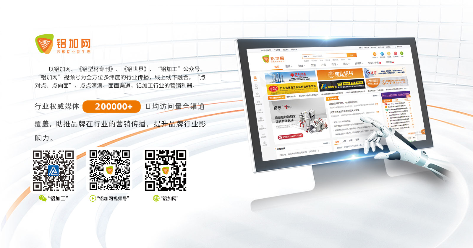 鋁加網(wǎng)(www.albiz.cn)是聞名鋁加工行業(yè)的垂直門戶網(wǎng)站,云聚鋁業(yè)新生態(tài),構(gòu)建鋁業(yè)新場景,以albiz.cn 網(wǎng)站為核心,以移動云端、鋁加工微信、鋁加網(wǎng)視頻號、《鋁型材??泛汀朵X世界》雜志為載體,成為了鋁加工行業(yè)資訊和精準傳播的首選傳媒。鋁加網(wǎng),采集和發(fā)布全行業(yè)信息資訊,提供線上展覽、在線直播、短視頻、品牌策劃、品牌運營、品牌傳播等全方位的專業(yè)服務(wù)。